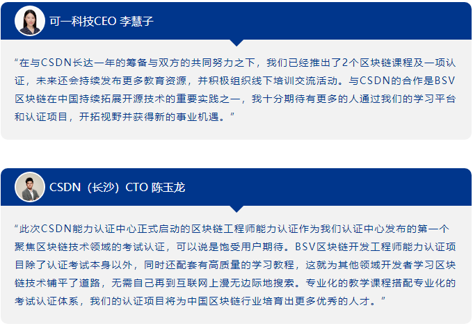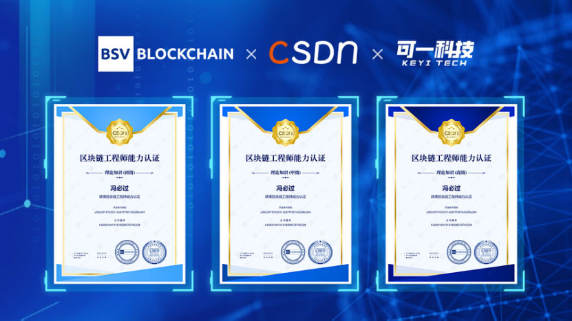 2022年6月6日,可一科技與CSDN聯(lián)合運營的BSV區(qū)塊鏈開發(fā)工程師能力認證項目推出了首門正式課程《區(qū)塊鏈原理初級》。本課程免費向公眾開放,在線學(xué)習(xí)時間約為9小時,學(xué)員在學(xué)習(xí)并通過全部階段測試后,可以在線申請進行終極測試,通過者將獲得由CSDN能力認證中心和BSV區(qū)塊鏈學(xué)院聯(lián)合頒發(fā)的“區(qū)塊鏈工程師初級認證證書”。