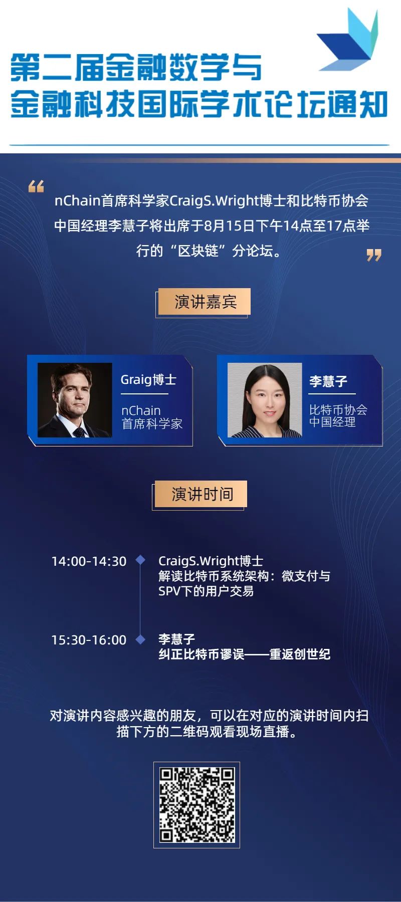 本屆論壇于8月14日設(shè)置了主會場,并于8月15日設(shè)置了金融科技、大數(shù)據(jù)與人工智能、區(qū)塊鏈、金融數(shù)學(xué)四個(gè)分會場?;顒?dòng)全程都將進(jìn)行線上直播。